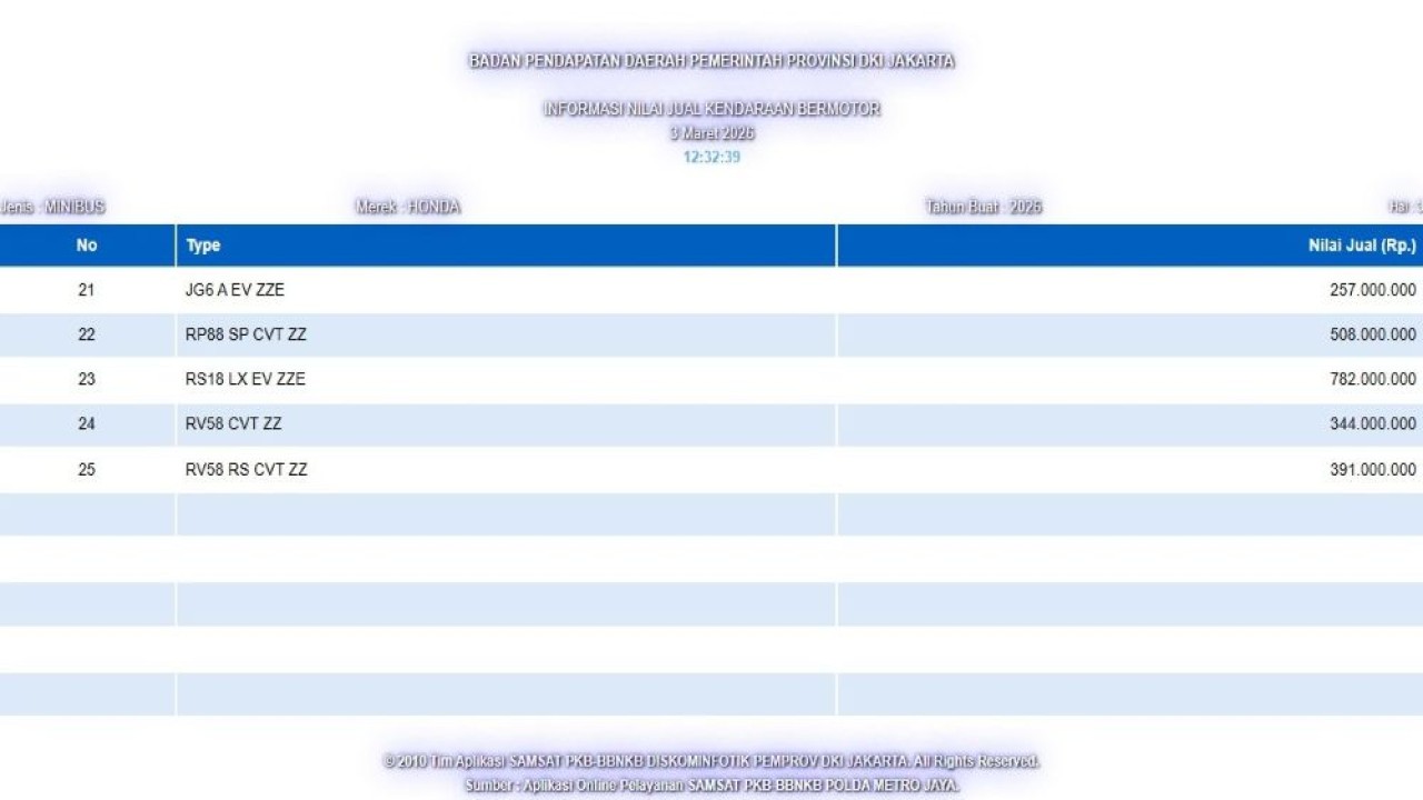 Daftar Nilai Jual Kendaraan Bermotor (NJKB) Pemprov DKI Jakarta tahun 2026. (Foto: Tangkapan layar)